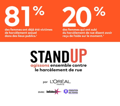 L’Oréal Paris, l’ONG Hollaback! et la Fondation des Femmes se sont unis pour construire un programme contre le harcèlement de rue. Ce programme intitulé Stand Up propose des gestes simples, mais déterminants, qui permettent d’intervenir en toute sécurité lorsqu’on est victime ou témoin de harcèlement de rue.
