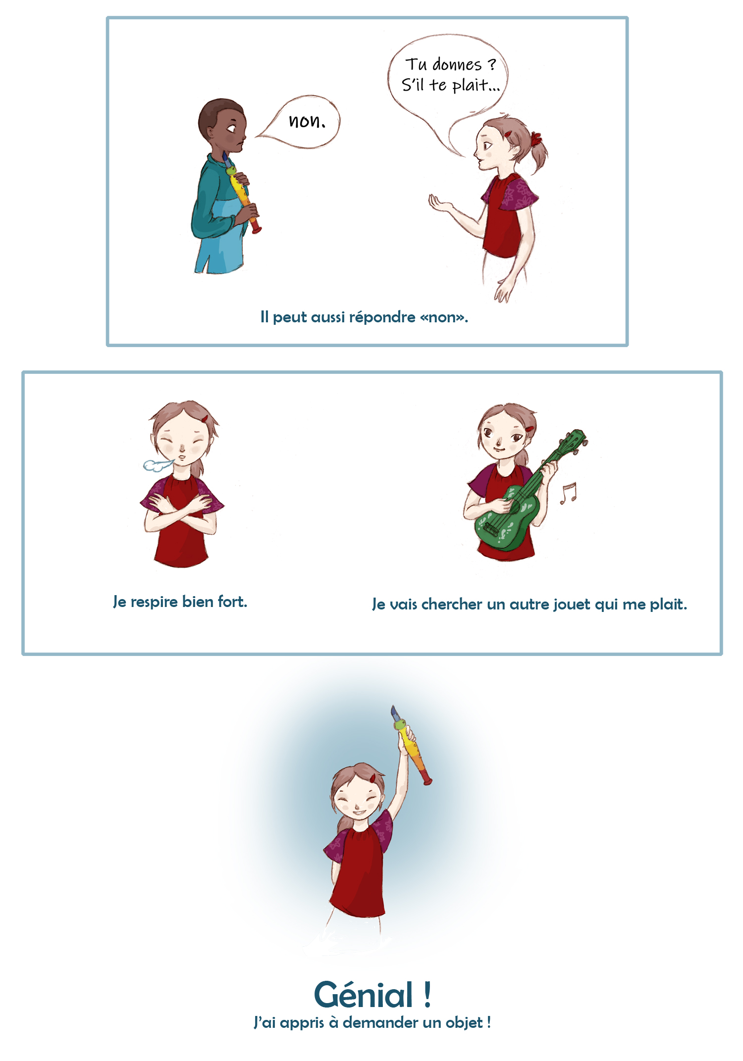 Bonjour, et merci ces fiches (non infantiles) mettent bien en évidence les scénarios de base en habiletés sociales. Je vis les utiliser auprès de jeunes en IME