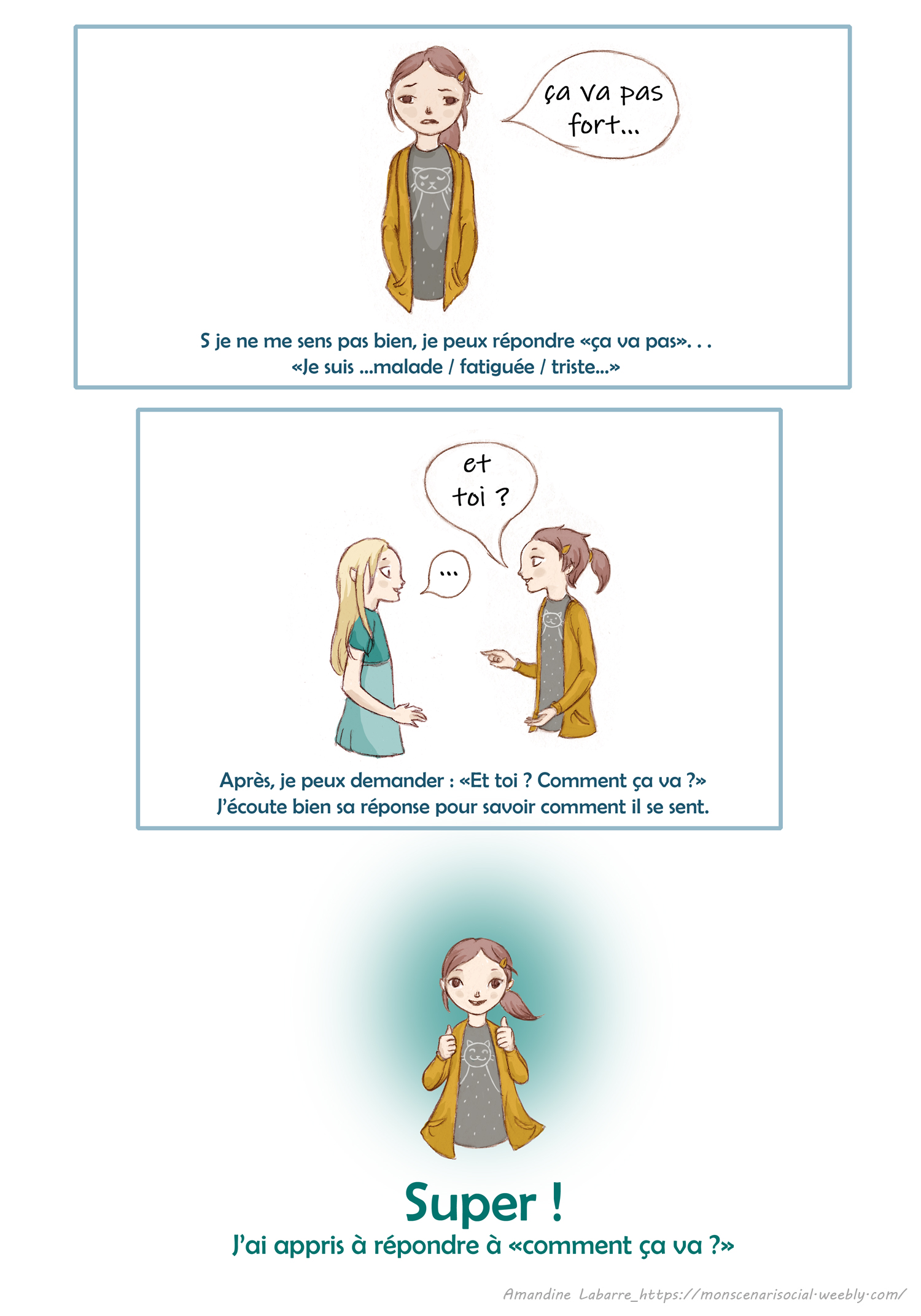 Bonjour, et merci ces fiches (non infantiles) mettent bien en évidence les scénarios de base en habiletés sociales. Je vis les utiliser auprès de jeunes en IME