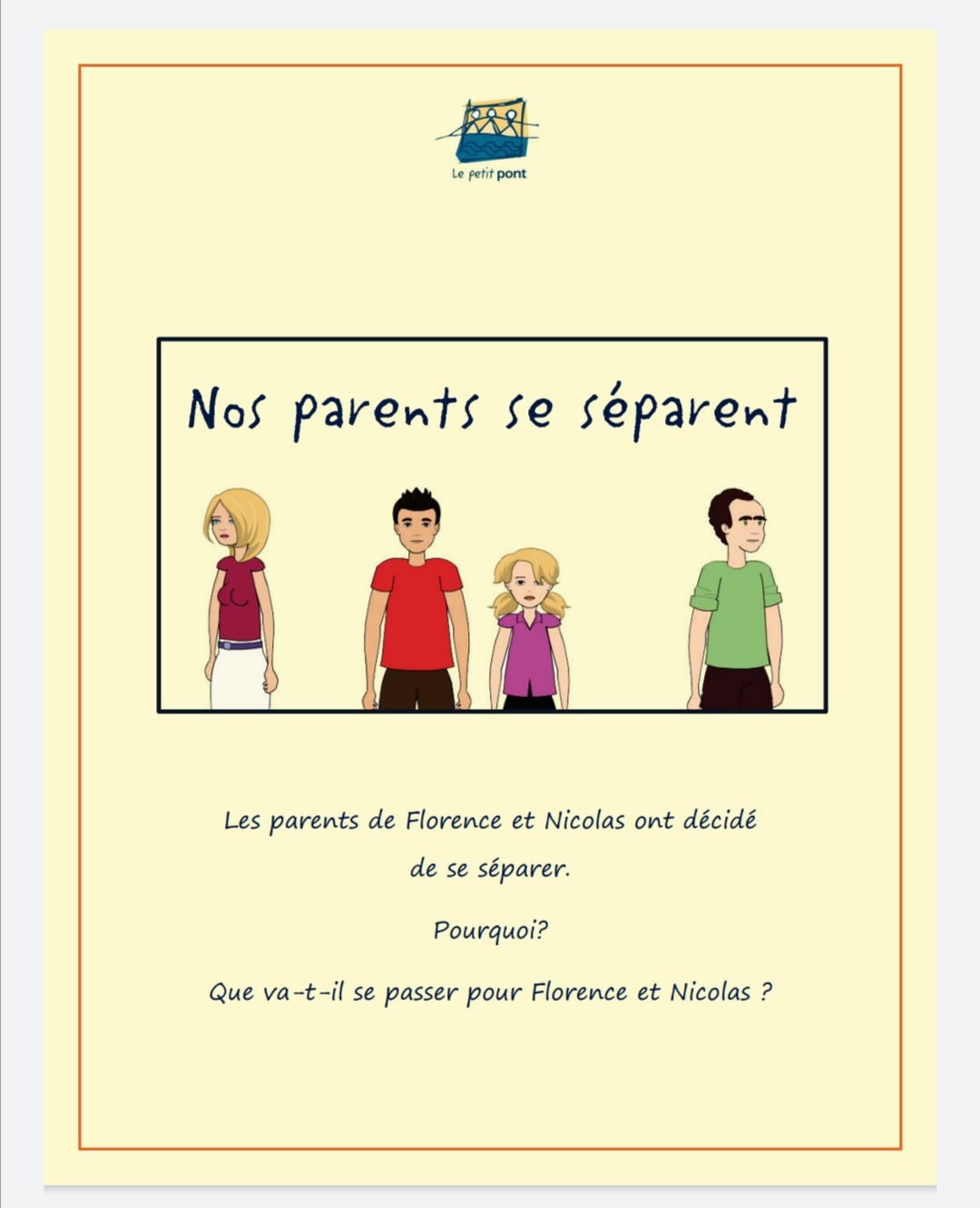 BD Nos parents se séparent ( à partir de 7 ans) ( Outil offert par l’association Le petit Pont ) Les parents de Florence et Nicolas se séparent. (la BD ilustre les étapes de la séparation et l’adaptation des parents et des enfants). ![]() A télécharger ici: http://www.petitpont.org/medias/doc/BD-nos%20parents%20se%20separent-2017.pdf |