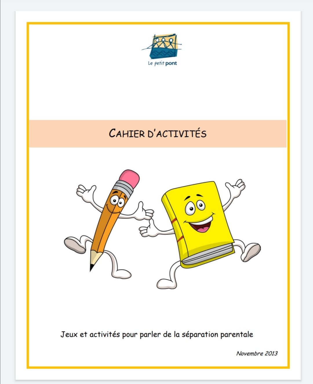 CAHIER D’ACTIVITES pour enfants sur le thème de la séparation parentale ( à partir de 7 ans) ( Outil offert par l’association Le petit Pont ) L’enfant peut se familiariser avec le contexte tout en s’amusant (jeu de mots cachés, jeu des différences, etc.) ![]() ![]() Cahier à télécharger: http://www.petitpont.org/medias/doc/Cahier%20activit%C3%A9s%20enfants-final.pdf |