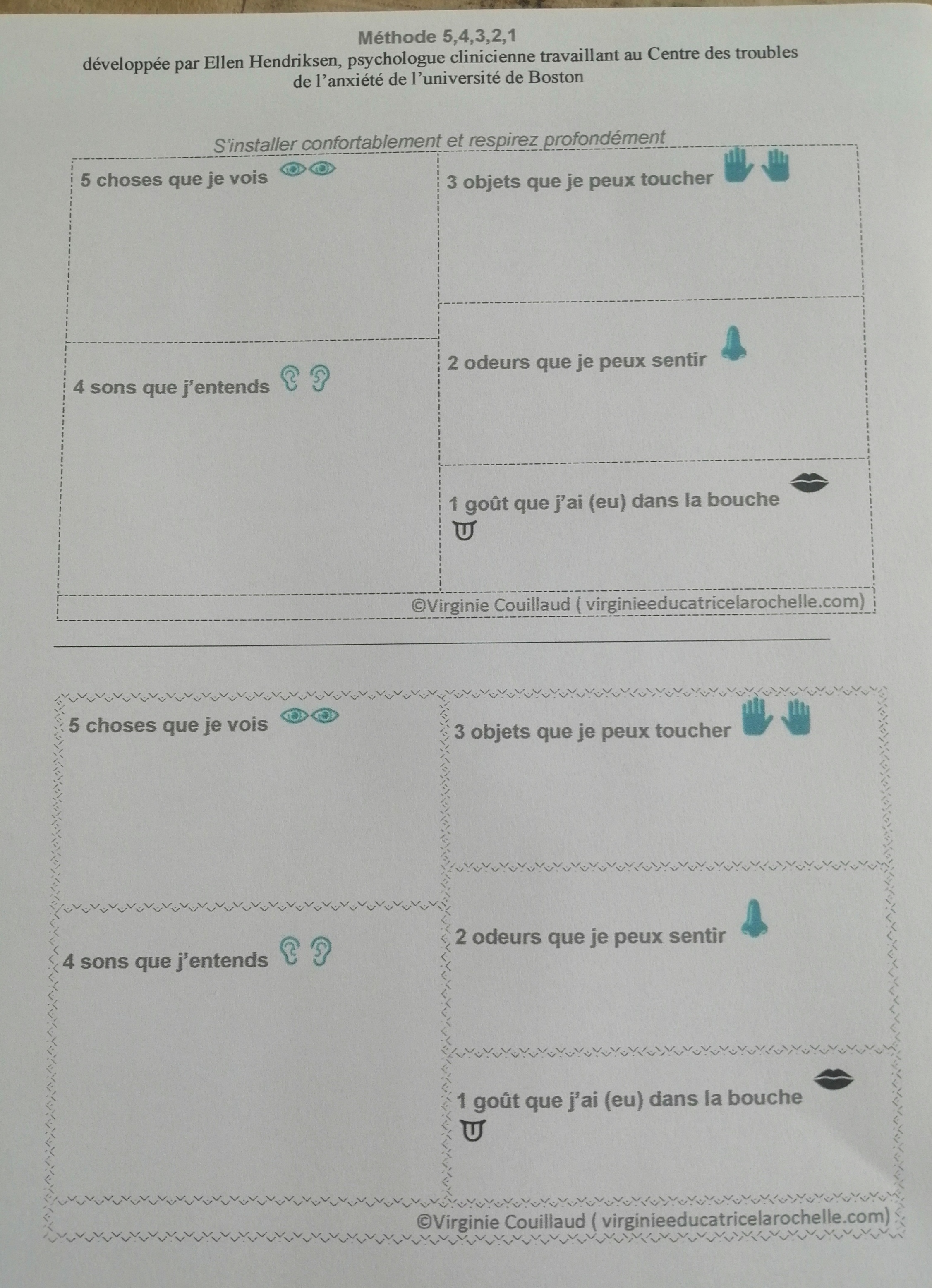 METHODE « 5-4-3-2-1 » ( développée par Ellen Hendriksen, psychologue clinicienne travaillant au Centre des troubles de l’anxiété de l’université de Boston) En mobilisant vos 5 sens (la vue, l’odorat, le toucher, le goût et l’ouïe), cette méthode permet de vous ancrer dans le moment présent et dans votre environnement actuel, plutôt que de vous concentrer sur les symptômes de votre crise ou sur les éléments du passé ou du futur qui sont à la source de vos angoisses • Première étape : réfléchissez à 5 objets ou éléments que vous pouvez voir sur le moment. Qu’il s’agisse d’un vase, d’un nuage, de votre chat Caramel ou de vos propres jambes, regardez rapidement autour de vous et nommez-les. • Deuxième étape : essayez de penser à 4 sensations que vous pouvez ressentir physiquement à l’instant T. Il peut s’agir du poids de votre corps sur le lit, de la chaleur de l’oreiller sous votre tête, ou encore du vent frais qui caresse vos pieds, par exemple. • Troisième étape : réfléchissez à 3 sons que vous pouvez entendre au moment de votre crise, comme les klaxons des voitures dans la rue, les conversations de vos collègues dans le bureau voisin ou bien le ronronnement de votre chat. • Quatrième étape : c’est le moment de mobiliser votre odorat. Pensez à deux odeurs qui parviennent à vos narines. Cela peut être votre propre parfum ou bien les effluves d’un repas en train de cuire dans la cuisine, par exemple. • Cinquième et dernière étape : concentrez-vous sur ce que vous pouvez goûter à ce moment même, comme le goût du jus de fruits que vous venez de boire ou celui du bain de bouche avec lequel vous vous êtes gargarisé·e un peu plus tôt. Voici une vidéo qui vous présente la méthode: |