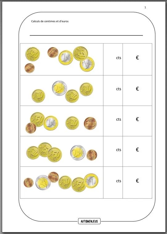 ![]() Exercices divers et dobble de la monnaie (Outils offerts par autismenjeux.fr) ![]() ![]() ![]() ![]() ![]() ![]() ![]() ![]() ![]() Tout ces documents sont a telecharger ici: https://www.autismenjeux.fr/decouvrir-les-euros/ |