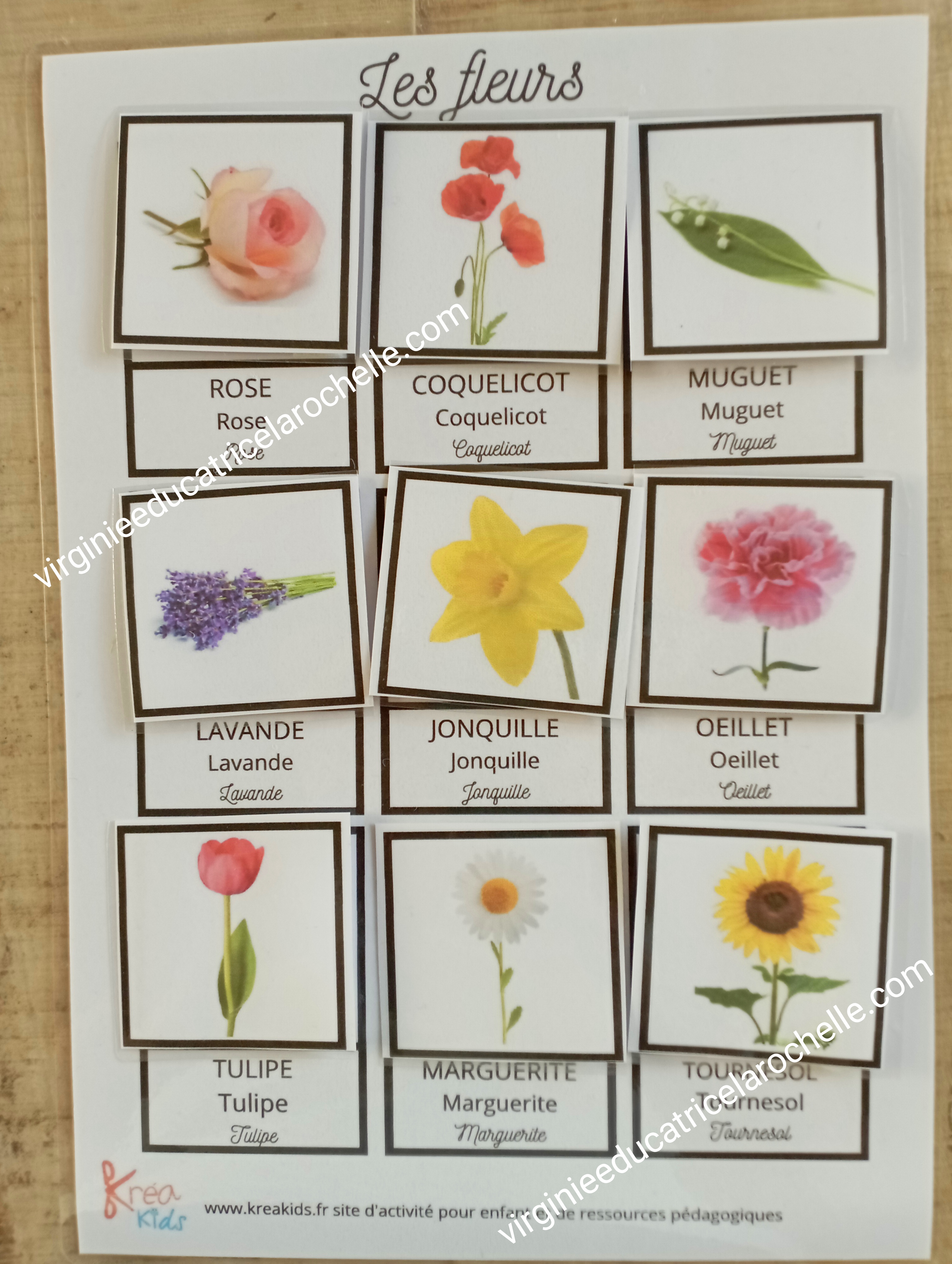 Planche 8 photos de FLEURS ( outil offert par Kreakids.fr) ![]() A télécharger ici:https://www.kreakids.fr/cartes-de-nomenclature-sur-les-fleurs-montessori/ |