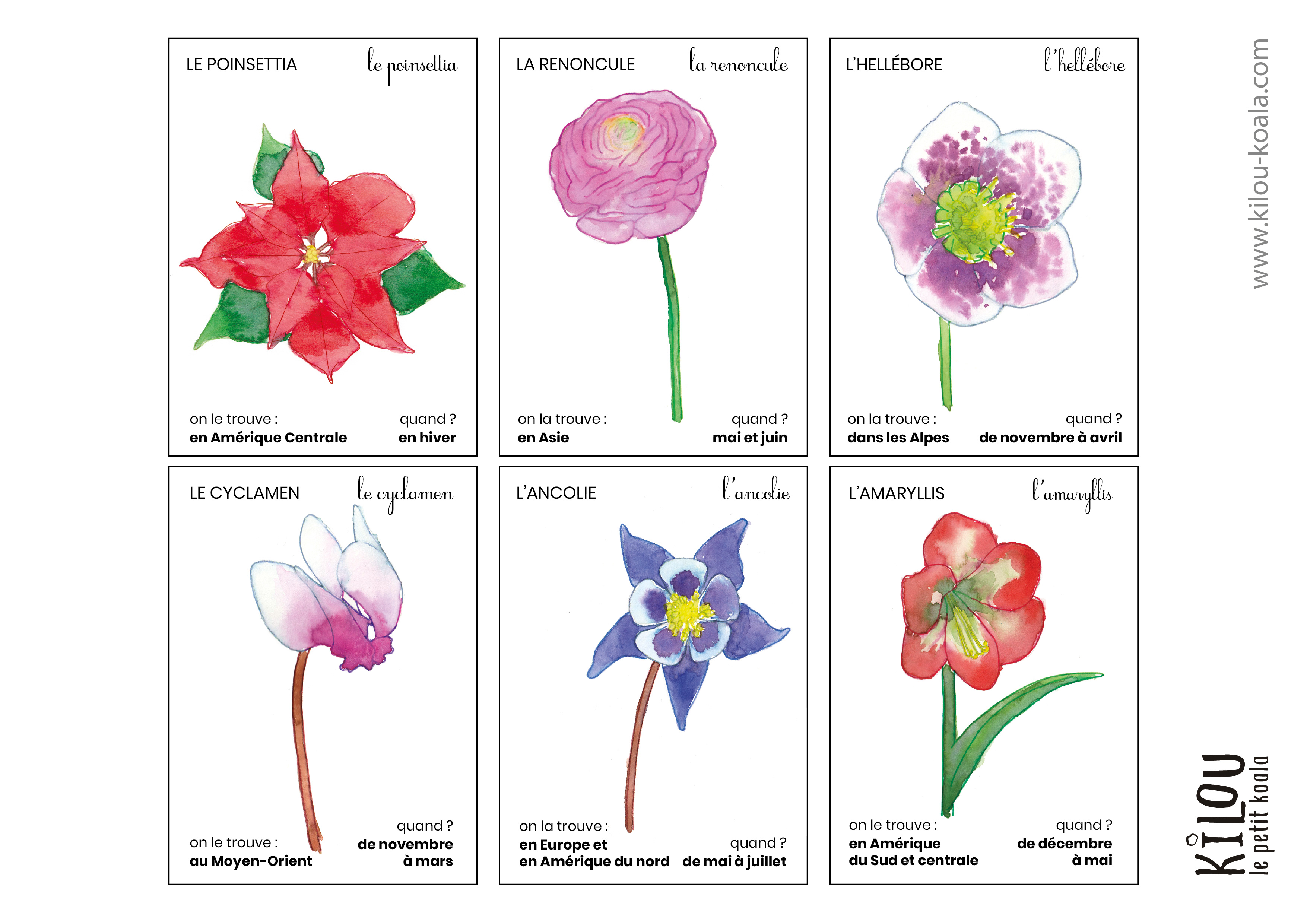 36 CARTES FLEURS à l’aquarelle (dessins naturalistes offerts par Kilou-koala.com ) ![]() ![]() ![]() ![]() ![]() ![]() ![]() A télécharger ici:https://kilou-koala.com/blog/category/activites/nomfleurs/ |