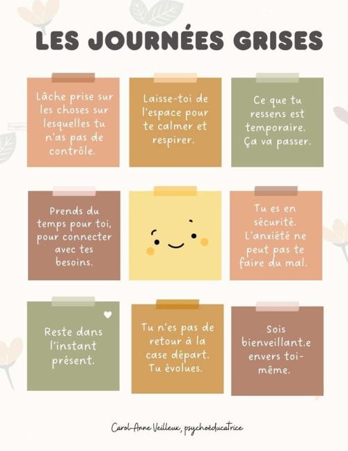 | CE QUE JE NE PEUX CONTROLER ( outil offert par la boiteapsy.com) Pour travailler la distanciation et la « juste » responsabilisation de la personne anxieuse. ![]() A télécharger ici: https://boiteapsy.com/wp-content/uploads/2020/12/Ce-que-je-peux-contro%CC%82ler…OU-PAS-.png |