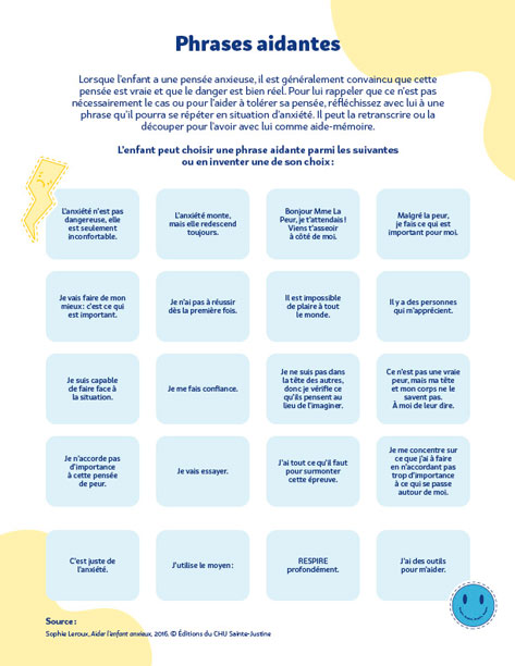 Outils pour amorcer une solution: RENFORCEMENT POSITIF (outils offerts par soutiensolutions.com) ![]() A télécharger gratuitement après l’avoir ajouté à votre panier: https://soutiensolutions.com/produit/ce-nest-pas-une-erreur/ PHRASES AIDANTES (outil offert par tuaslederniermot.com) Lorsque l’enfant a une pensée anxieuse, il est généralement convaincu que cette pensée est vraie et que le danger est bien réel. Pour lui rappeler que ce n’est pas nécessairement le cas ou pour l’aider à tolérer sa pensée, réfléchissez avec lui à une phrase qu’il pourra se répéter en situation d’anxiété. ![]() A télécharger ici: https://tuaslederniermot.com/wp-content/uploads/2021/08/Respire2-2021-Outils-PhrasesAidantes-Mandala-V3.pdf |