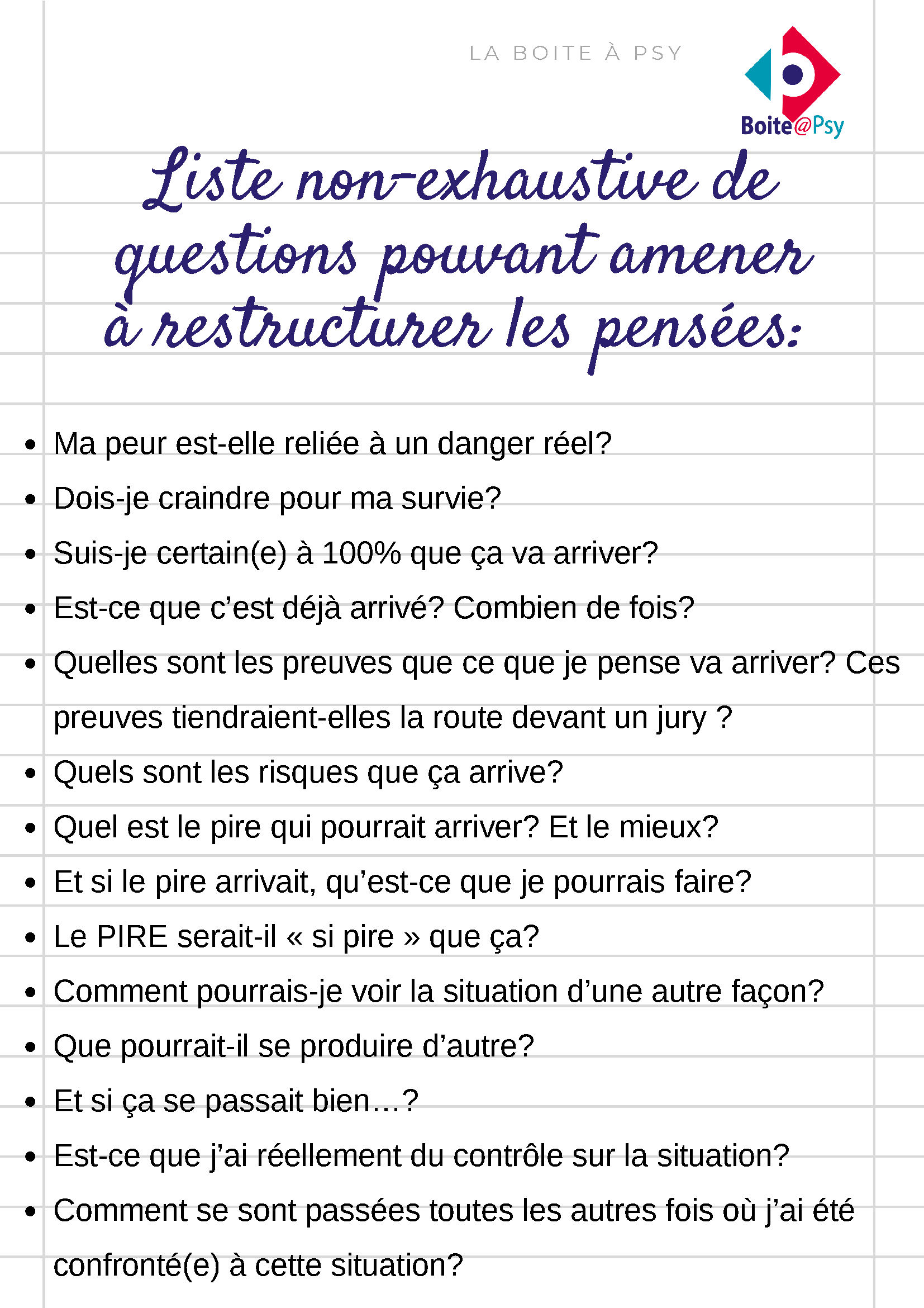 Outils pour amorcer une solution: LE CHEMIN DE LA PENSEE ANXIEUSE/ ELEMENT DECLENCHEUR (outils offerts par soutiensolutions.com) ![]() A télécharger gratuitement après l’avoir ajouté à votre panier: https://soutiensolutions.com/produit/chemin-de-la-pensee-anxieuse/ ![]() A télécharger gratuitement après l’avoir ajouté à votre panier: https://soutiensolutions.com/produit/deconstruire-ses-pensees-automatiques/ |