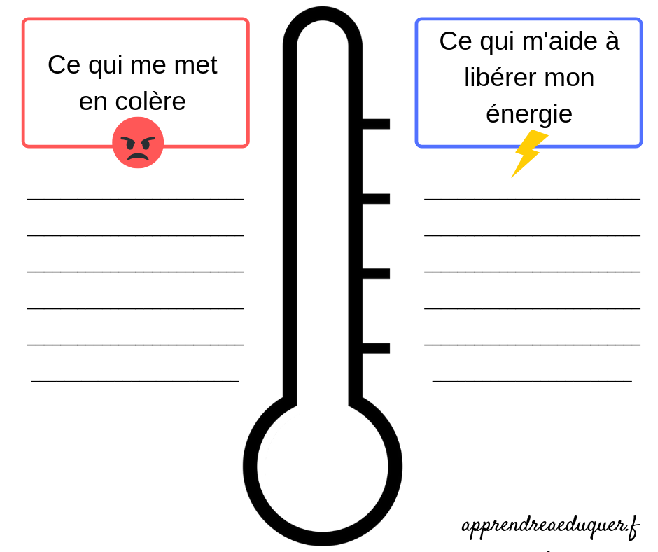Ballon/thermomètre de la colère ( Outil offert par les éditions placote) Ce Ballon a été créé par Simon MICHAUD et a obtenu le prix HSBC du Salon Jeunes-PROJET. En 2015, Simon Michaud, un élève de 12 ans, de l’école Clotilde-Raymond, à Saint-Rémi au Québec, avait de la difficulté à gérer ses émotions en classe. Il a imaginé un outil visuel permettant de prendre conscience de son état, pour éviter qu’une crise éclate: le thermomètre des émotions. L’outil inventé par Simon Michaud a été rebaptisé Le thermomètre de la colère par les Éditions Passe-Temps. ![]() Téléchargez le thermomètre de la colère CE QUI M’AIDE ( Outil offert par apprendreaeduquer.fr ) Un autre outil qui peut être utile en amont. Comme toujours, les outils d’éducation émotionnelle sont à présenter à froid, pas au cours d’une crise. ![]() Ce qui m’aide thermomètre du site apprendreaeduquer.fr Télécharger |