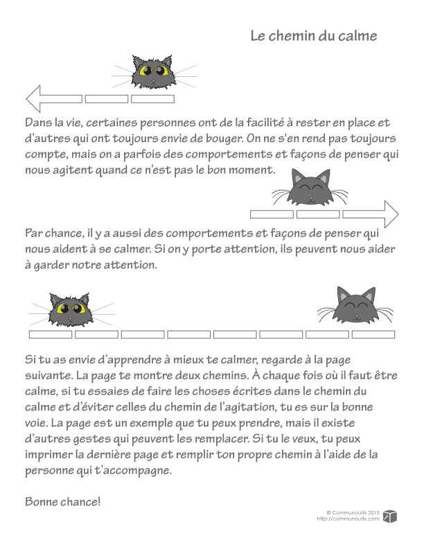 LE CHEMIN Du CALME (Outil offert par communoutils.com) Exercice favorisant les comportements positifs afin de travailler sur le calme et l’écoute dans les moments pertinents. L’outil explique qu’il y a de bons et de moins bons comportements pour aider à être attentif et donne des exemples. Par la suite, le jeune a la possibilité de remplir ses propres comportements à suivre avec l’intervenant et peut garder sa fiche comme aide-mémoire. ![]() https://communoutils.com/le-chemin-du-calme/ |
