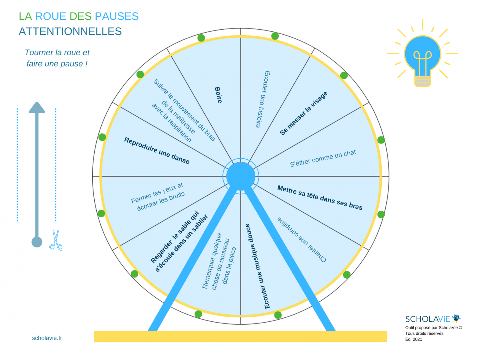 ROUE DE LA PAUSE ATTENTIONNELLE (Outils offerts par ScholaVie.fr: ScholaVie est une association loi 1901 spécialisée dans le développement des compétences socio-émotionnelles (CSE)) L’attention est fluctuante et varie d’un être à l’autre, d’une activité à l’autre, etc. Pour maintenir l’attention, il s’agit parfois de faire des pauses. Ces pauses libèrent de l’espace dans le cerveau, permettent de mobiliser la mémoire, engagent le corps et les sens, permettent à chacun de se recentrer et de retrouver de l’énergie. Cela ne vous fait pas perdre du temps, bien au contraire, vous en gagnerez par la suite ! ![]() A retrouver ici: https://scholavie.fr/outil_pedagogique/roue-des-pauses-attentionnelles/ |