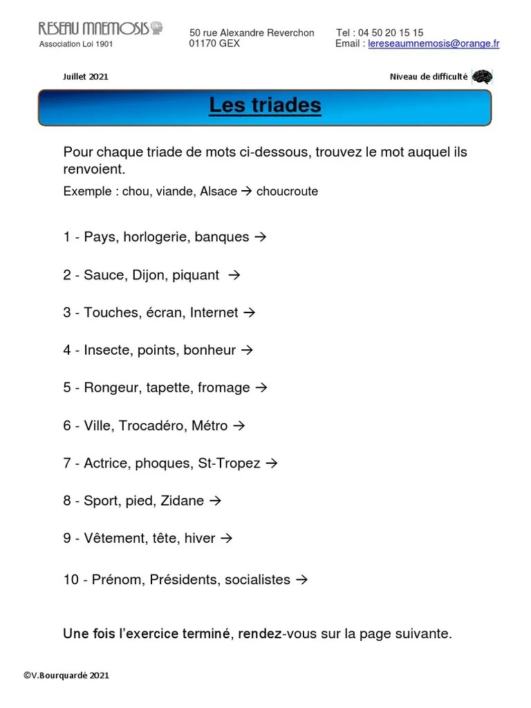 ATELIER MEMOIRE ( offert par Réseau Mnemosis, Association à but non lucratif reconnue d’intérêt général, prenant en charge les personnes atteintes de la maladie d’Alzheimer ou apparentées.) ![]() ![]() Octobre 2024 : Les spécialités médicales Niveau facile ( [télécharger] [visualiser] Niveau difficile ( [télécharger] [visualiser] Septembre 2024 : Degrés Celsius et Fahrenheit Niveau facile ( [télécharger] [visualiser] Niveau difficile ( [télécharger] [visualiser] Aout 2024 : Que trouve t’on dans … Niveau facile ( [télécharger] [visualiser] Niveau difficile ( [télécharger] [visualiser] Juillet 2024 : Les Jeux Olympiques Niveau facile ( 118,12 kB) [télécharger] [visualiser] Niveau difficile ( 124,85 kB) [télécharger] [visualiser] Juin 2024 : Décodage et calcul Niveau facile ( [télécharger] [visualiser] Niveau difficile ( [télécharger] [visualiser] Mai 2024 : Les 26 mots Niveau facile ( 115,54 kB) [télécharger] [visualiser] Niveau difficile ( 136,97 kB) [télécharger] [visualiser] Avril 2024 : Qu’est ce que cela signifie? Niveau facile ( [télécharger] [visualiser] Niveau difficile ( [télécharger] [visualiser] Mars 2024 : Mots à compléter Niveau facile ( [télécharger] [visualiser] Niveau difficile ( [télécharger] [visualiser] Février 2024 : Théâtre Niveau facile ( [télécharger] [visualiser] Niveau difficile ( [télécharger] [visualiser] Janvier 2024 : Les Menus Niveau facile ( [télécharger] [visualiser] Niveau difficile ( [télécharger] [visualiser] Décembre 2023 : Classement par ordre alphabétique Niveau facile ( 150,70 kB) [télécharger] [visualiser] Niveau difficile ( [télécharger] [visualiser] Novembre 2023 : Mots à caser Niveau facile ( [télécharger] [visualiser] Niveau difficile ( [télécharger] [visualiser] Octobre 2023 : Septembre 2023 : Anagrammes mêlées Niveau facile ( [télécharger] [visualiser] Niveau difficile ( [télécharger] [visualiser] Août 2023 : Mots de 7 lettres Niveau facile ( 143,78 kB) [télécharger] [visualiser] Niveau difficile ( 170,34 kB) [télécharger] [visualiser] Juillet 2023 : Suites de nombres Niveau facile ( 138,43 kB) [télécharger] [visualiser] Niveau difficile ( 141,18 kB) [télécharger] [visualiser] Juin 2023 : Paire de mots Niveau facile ( 131,09 kB) [télécharger] [visualiser] Niveau difficile ( 144,93 kB) [télécharger] [visualiser] Mai 2023 : Liste de courses Niveau : facile ( [télécharger] [visualiser] Niveau : difficile ( [télécharger] [visualiser] Avril 2023 : Codages Niveau : facile ( [télécharger] [visualiser] Niveau : difficile ( [télécharger] [visualiser] Mars 2023 : Arbre généalogique Niveau : facile ( [télécharger] [visualiser] Niveau : difficile ( [télécharger] [visualiser] Février 2023 : Lettres doubles Niveau : facile ( [télécharger] [visualiser] Niveau : difficile ( [télécharger] [visualiser] Janvier 2023 : Anagrammes Niveau : facile ( [télécharger] [visualiser] Niveau : difficile ( [télécharger] [visualiser] Décembre 2022 : Problèmes mathématiques Niveau : facile ( [télécharger] [visualiser] Niveau : difficile ( [télécharger] [visualiser] Novembre 2022 : Le monde en Vrac Niveau : facile ( [télécharger] [visualiser] Niveau : difficile ( [télécharger] [visualiser] Octobre 2022 : Expressions à retrouver Niveau : Facile ( [télécharger] [visualiser] Niveau : Difficile ( [télécharger] [visualiser] Septembre 2022: Codage et calcul Niveau : facile ( [télécharger] [visualiser] Niveau : difficile ( [télécharger] [visualiser] Aout 2022: Rimes Niveau : facile ( [télécharger] [visualiser] Niveau : difficile ( [télécharger] [visualiser] Juillet 2022 : Quizz de l’alphabet Niveau : facile ( [télécharger] [visualiser] Niveau : difficile ( [télécharger] [visualiser] Juin 2022 : Phrases mélangées Niveau : facile ( [télécharger] [visualiser] Niveau : difficile ( [télécharger] [visualiser] Mai 2022 : Mots cachés Niveau : facile ( [télécharger] [visualiser] Niveau : difficile ( [télécharger] [visualiser] Avril 2022 : syllabes manquantes Niveau : facile ( [télécharger] [visualiser] Niveau : difficile ( [télécharger] [visualiser] Mars 2022 : Lettres manquantes Niveau : facile ( [télécharger] [visualiser] Niveau : difficile ( [télécharger] [visualiser] Février 2022 : Les homophones Niveau : facile ( [télécharger] [visualiser] Niveau : Difficile ( [télécharger] [visualiser] Janvier 2022 : Le repas convivial Niveau : facile ( [télécharger] [visualiser] Niveau : difficile ( [télécharger] [visualiser] Décembre 2021 : Cherchez l’intrus Niveau : facile ( 183,43 kB) [télécharger] [visualiser] Niveau : difficile ( [télécharger] [visualiser] Novembre 2021 : 3 mots pour une phrase Niveau : facile ( [télécharger] [visualiser] Niveau : difficile ( [télécharger] [visualiser] Octobre 2021 : calculs croisés Niveau : facile ( [télécharger] [visualiser] Niveau : difficile ( [télécharger] [visualiser] Septembre 2021 : d’où vient le problème ? Niveau : facile ( [télécharger] [visualiser] Niveau : difficile ( [télécharger] [visualiser] Août 2021 : barrage Niveau : facile ( [télécharger] [visualiser] Niveau : difficile ( [télécharger] [visualiser] Juillet 2021 : les triades Niveau : facile ( [télécharger] [visualiser] Niveau : difficile ( [télécharger] [visualiser] Juin 2021 : synonymes Niveau : facile ( [télécharger] [visualiser] Niveau : difficile ( [télécharger] [visualiser] Mai 2021 : suites logiques Niveau : facile ( [télécharger] [visualiser] Niveau : difficile ( [télécharger] [visualiser] Avril 2021 : méli-mélo Niveau : facile ( [télécharger] [visualiser] Niveau : difficile ( [télécharger] [visualiser] Mars 2021 : mots clefs Niveau : facile ( [télécharger] [visualiser] Niveau : difficile ( [télécharger] [visualiser] Février 2021 : message codé Niveau : facile ( [télécharger] [visualiser] Niveau : difficile ( [télécharger] [visualiser] Janvier 2021 : alternanc